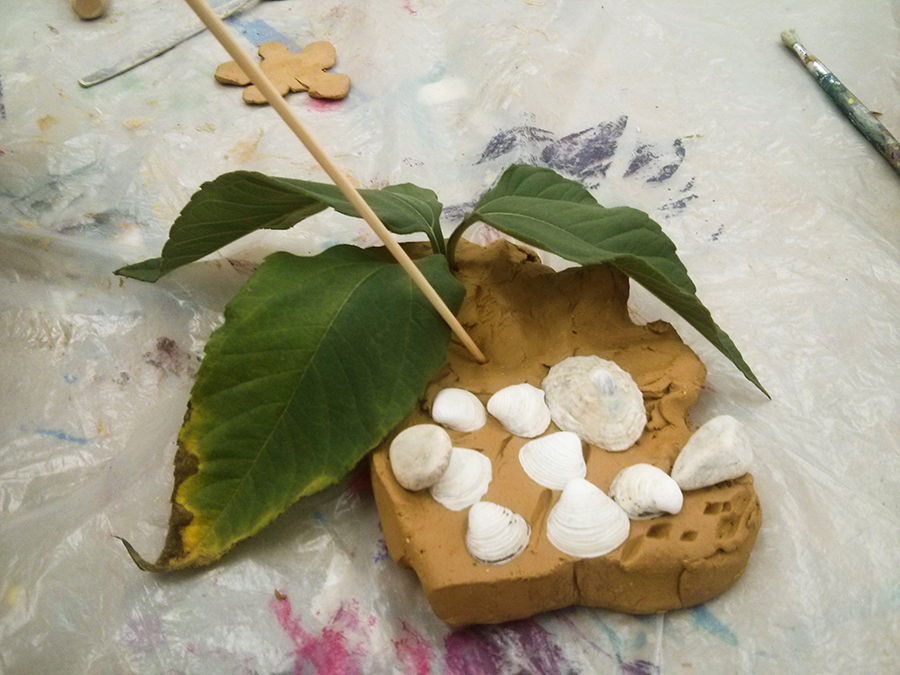Heute haben wir mit Ton gearbeitet. Ein kleines Schatzkästchen mit allerhand interessanten Dingen wurde entdeckt und die Materialien wie Muscheln, Blätter, Erbsen und Steine in das gebaute Tonobjekt integriert. Die Kinder hatten großen Spaß am freien Assoziieren und Experimentieren mit dem Material. Spannend war es, den Prozess der Arbeiten zu beobachten.