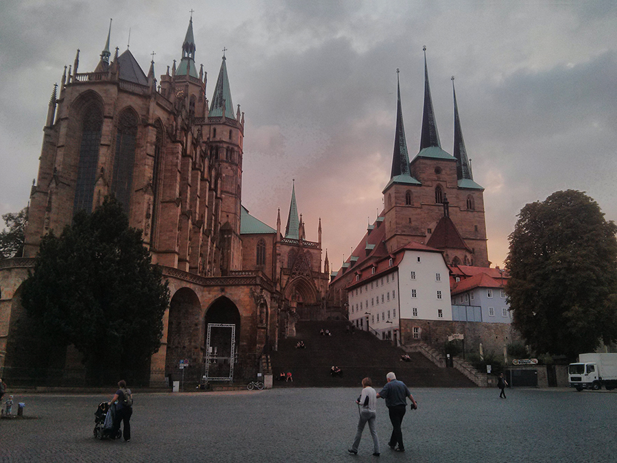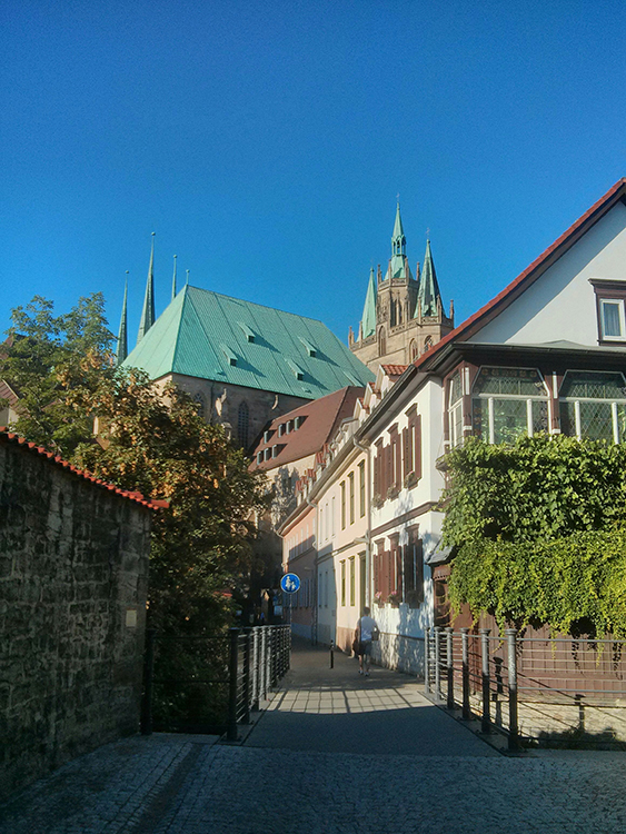 Erfurt! Eine schöne Stadt. Hier werde ich jetzt öfter sein. Ich habe die Weiterbildung Kinder_Kunst_Räume begonnen. Sie ist eine Kooperation zwischen dem SPI in Berlin und der Universität in Erfurt. Mehrere KünstlerInnen verschiedensten Alters treffen aufeinander, lernen sich kennen und erarbeiten sich gemeinsam Themen wie wahrnehmendes Beobachten, Ko-Konstruktivismus, Autobiografiearbeit, Bildungspläne in Sachsen, Thüringen und Berlin … Es macht mir großen Spaß an dieser Weiterbildung teilzunehmen. Ich entdecke mich neu, erfahre auch viel über andere Künstler, deren Arbeit, Ansichten und Lebensentwürfe, Themen der pädagogischen Arbeit und lerne die Stadt Erfurt zum ersten Mal richtig kennen.