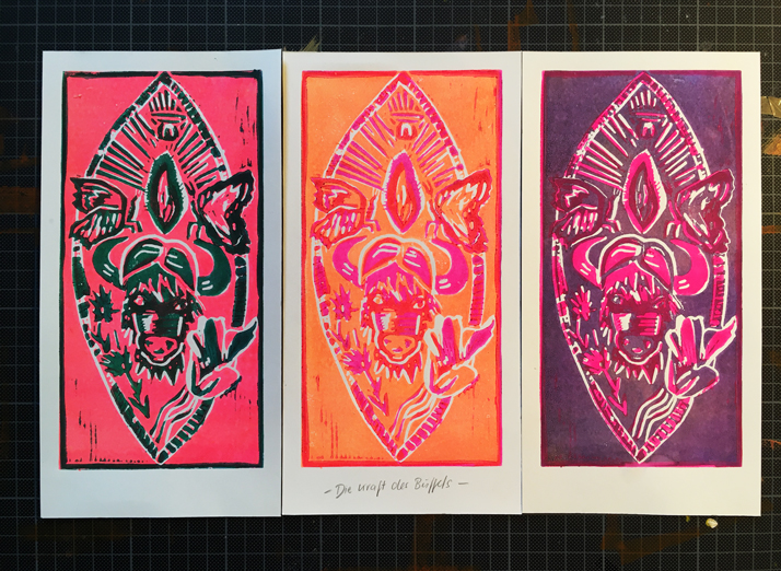 Verschiedene Linolschnitte, die in mehreren Farbvarianten zu unterschiedlichen Ideen, Anlässen und Gegebenheiten entstanden sind.