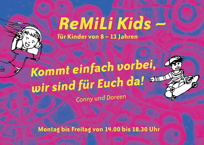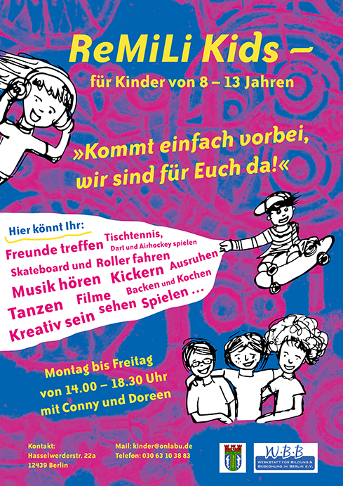 Für die ReMiLi-Kids, eine Freizeitstätte in Schöneweide, direkt am Schiff ReMiLi, der Spree und dem Kaisersteg gelegen, habe ich Flyer und Plakate gestaltet. Das war mir eine besonders große Freude und ich hoffe, dass ich in nächster Zeit noch mehr soziale Projekte mit meiner Gestaltung unterstützen kann.